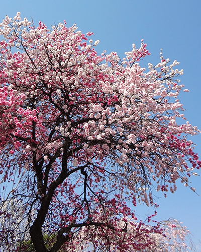 一本の幹に白~薄ピンク~ピンク~濃ピンクの花が咲くご近所さんの桃。濃淡まじってかわいい。