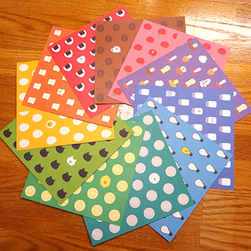 寒くてブルブル震えてるから、特に円形に配置したやつが全然うまく並べられなくて四苦八苦してた。指がとなりの紙にぶつかるとヘロ~ンって動いちゃってそれ直そうとしてまた違う紙を動かしちゃって、ますます寒いしますますブルブルするしでとにかくブルブルだった。でも心はウキウキだった。わーい。