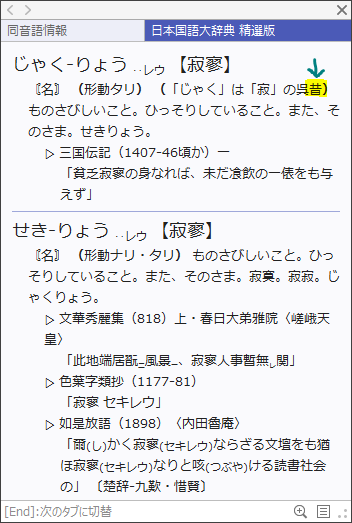 辞典で他の語も出してみたら「呉音」となっているので、たまたま寂寥の項は間違っちゃったんでしょうね。