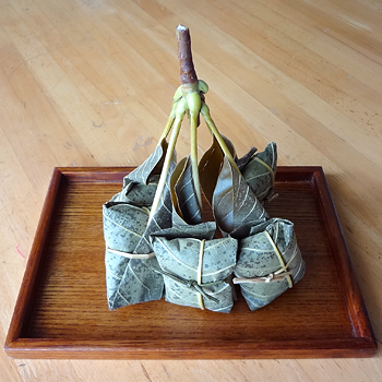 枝分かれしてる葉っぱそれぞれでお餅が包んである。おもしろい。