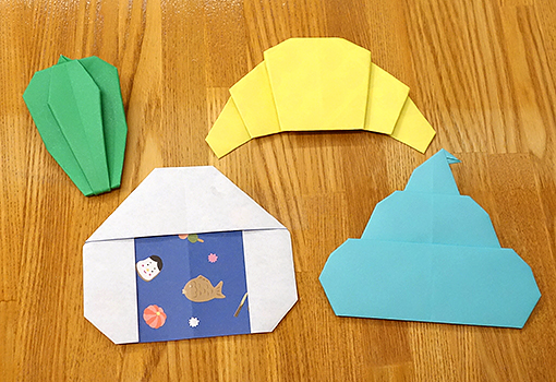snowさんのは和柄がかわいい(おにぎりの折り紙に使用)からモチーフ自体の主張が無いもののほうがいいのかなぁ。箱とか。でも箱って、作るのは楽しいけどその後使わなくない????それだともったいないよなぁ。
